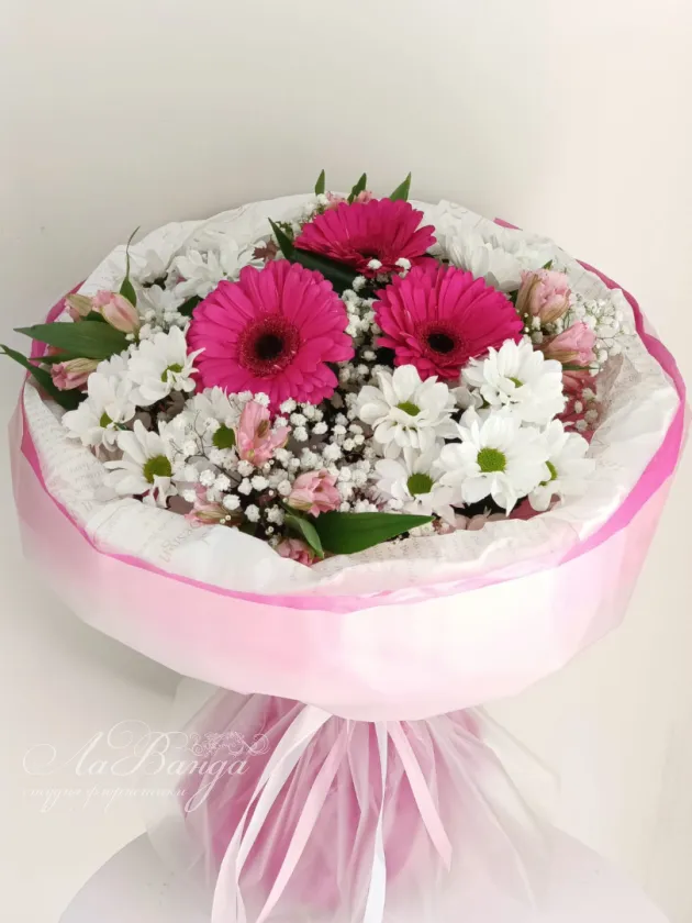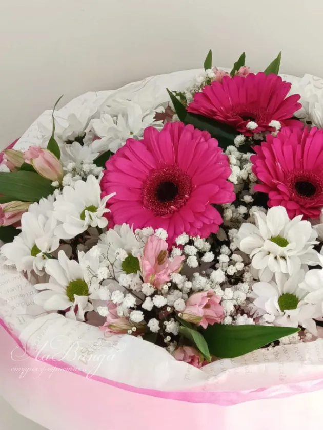 Букет на фотографии - пример нашей работы. Цветы в букете могут быть заменены в зависимости от сезона. Если в наличии каких-то цветов не будет, мы свяжемся с вами для уточнения деталей.