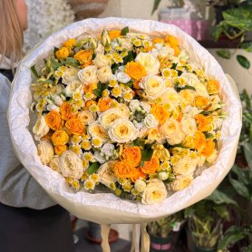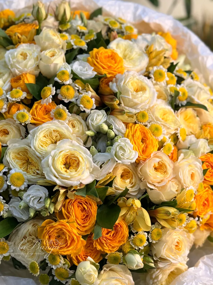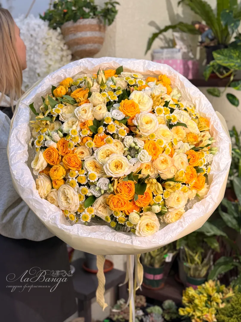 Букет на фотографии - пример нашей работы. Цветы в букете могут быть заменены в зависимости от сезона. Если в наличии каких-то цветов не будет, мы свяжемся с вами для уточнения деталей.